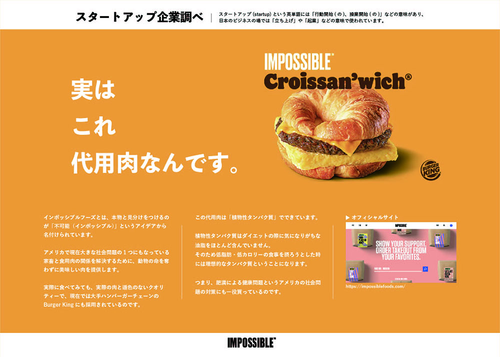 スタートアップ企業について学んだ際に制作したパネルです。私は「インポッシブルフーズ」という企業を選び、調べてからパネルを作成しました。上半分で見る人の目を引き、キャッチコピーを見てもらうことで下半分の会社概要を見てもらえるようになっています。もっともこだわったところはやはりアイキャッチです。いかにして自分のパネルを見てもらうかを考え、画像とともにメッセージ性の強いコピーを大胆に配置しました。