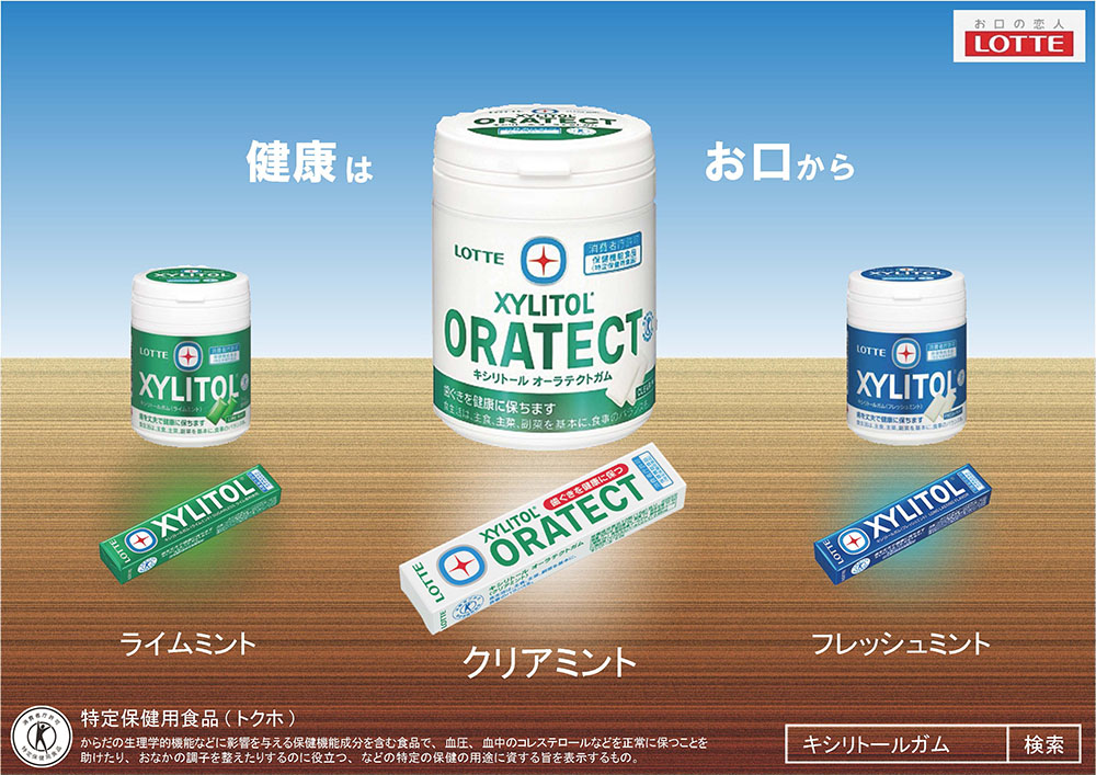 デザインの授業中に制作した、商品広告のフライヤーです。木のテーブルにガムが置いてあるイメージです。ミントのガムということで、上半分の背景色は爽やかな青色を選びました。そして最下部には、特定保健用食品の説明ならびに検索への誘導も設けました。これは街で見かける広告によく入っている要素だと思ったので入れました。